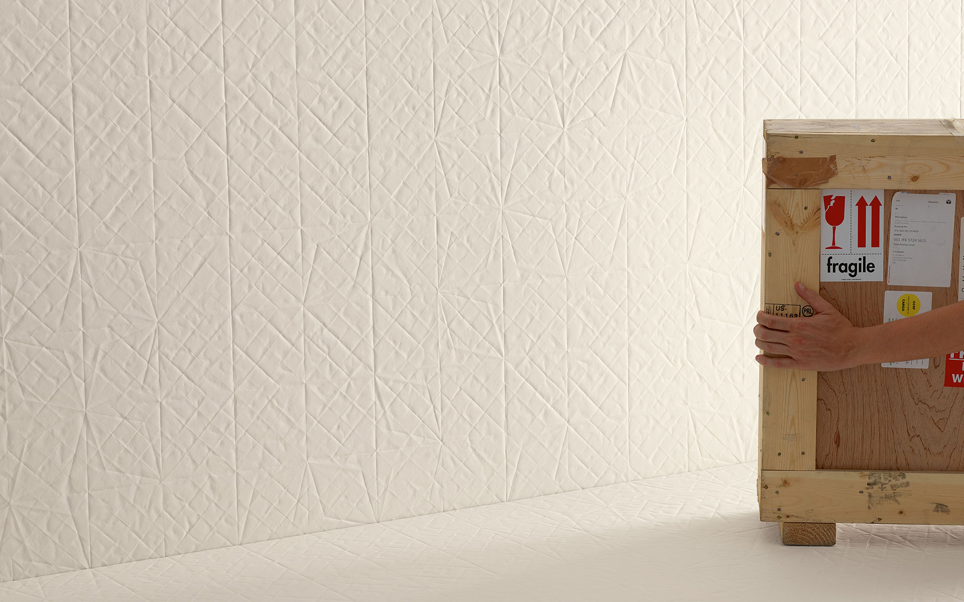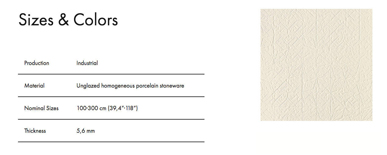 Folded XL has the same effect of folded paper of the collection of the same name, but in a larger size: 100 x 300 cm, with a thickness of 5,6 mm. The new collection is made entirely in an extra white body of porcelain stoneware, without the addition of glazes or colouring agents. Folded XL is made from pure ceramic matter, which is then pressed in a latest generation machine that makes it possible, for the first time, to create textured surfaces even on large slabs. Folded XL is suitable for both floor and wall tiles, for indoor and outdoor use, as its technical characteristics well exceed the limits prescribed by the international standards for large, unglazed slabs.